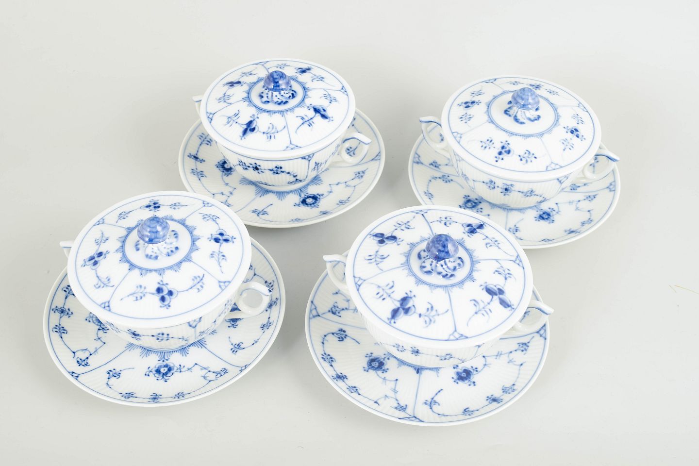Royal Copenhagen Musselmalet Riflet, sæt på fire bouillon-kopper med tilhørende underkopper.