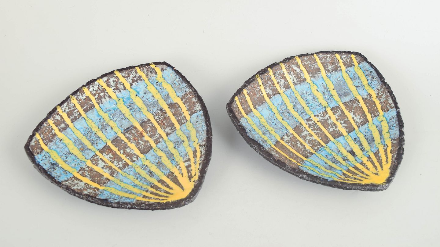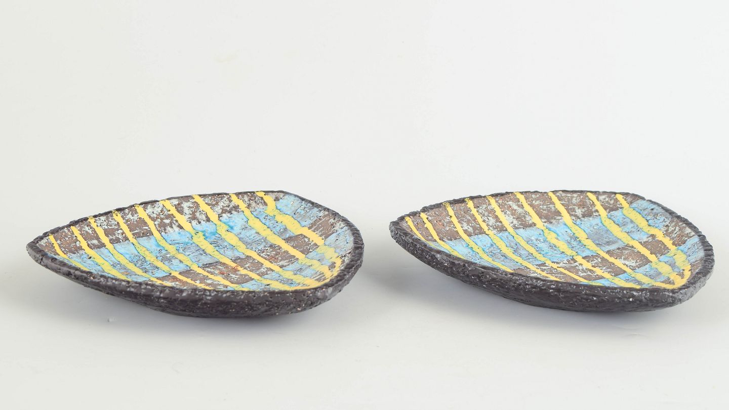 To mindre ovale keramikfade model 2548, udført i stentøj med reliefdekoration og flerfarvet glasur i blå og gule nuancer.