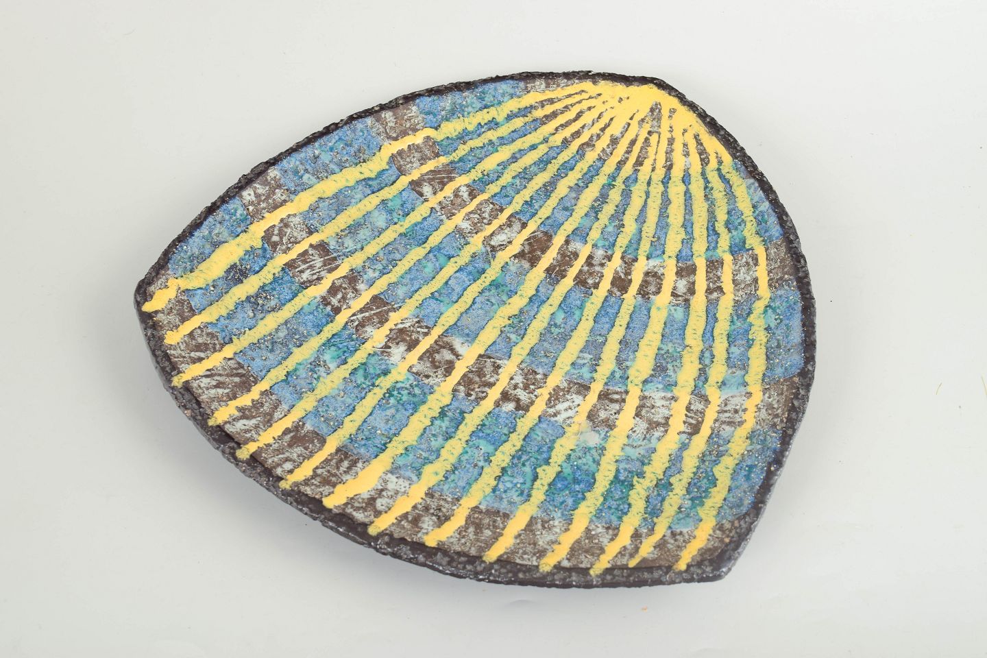 Stort ovalt keramikfad med modelnummer 2350, udført i stentøj med reliefdekoration og flerfarvet glasur i blå og gule nuancer.