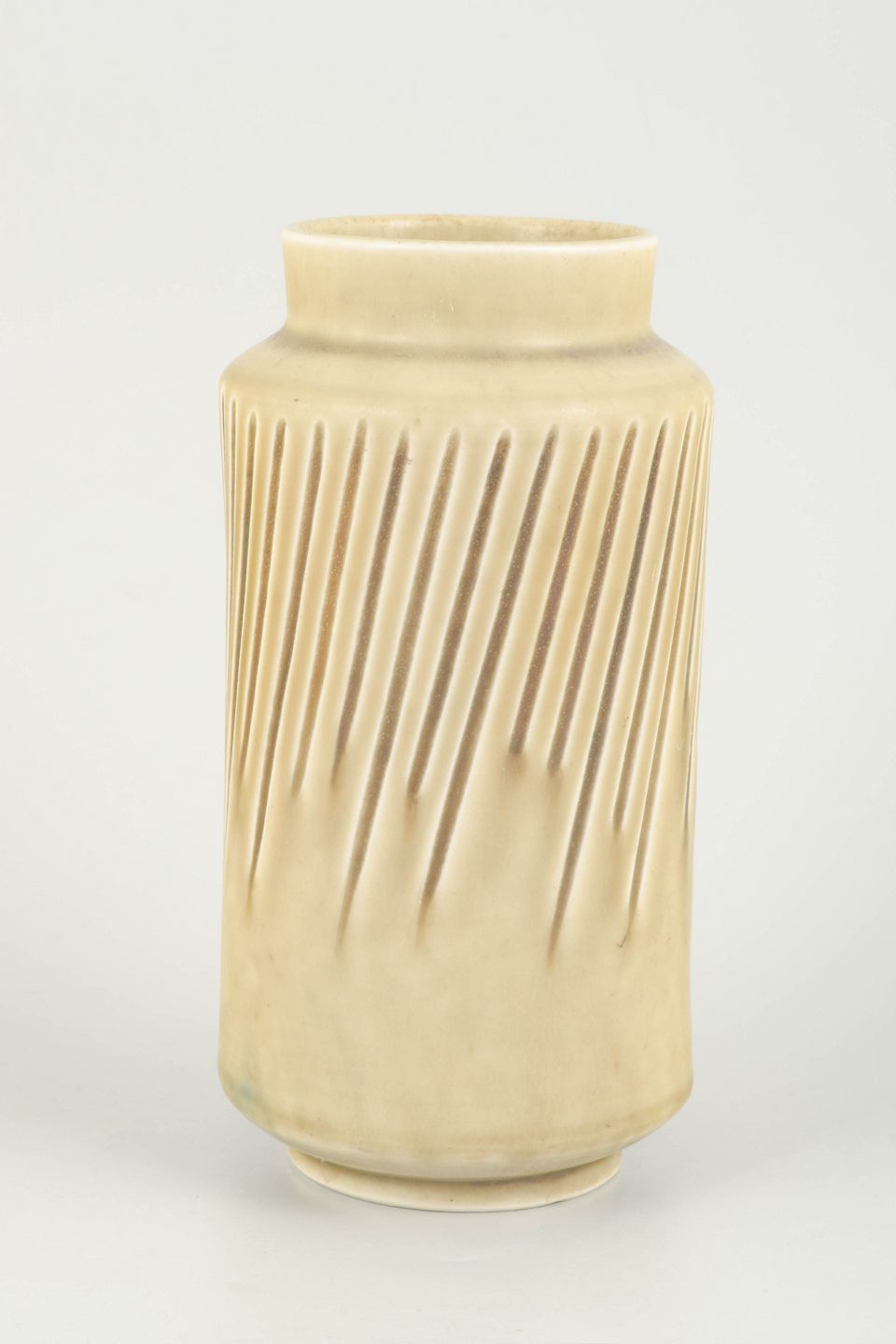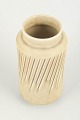 Cylinderformet vase i stentøj med lodrette, diagonalt skårne reliefspor og ensartet, lys beige glasur. Stram og modernistisk form med markant struktureret overflade.