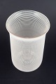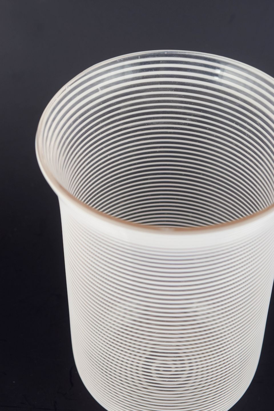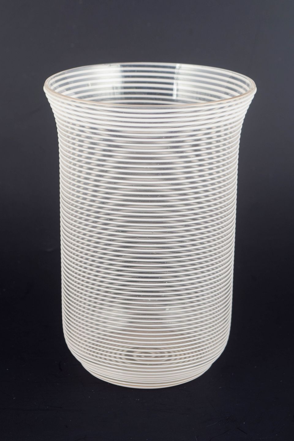 Cylindrical art glass vase in clear glass with closely spaced horizontal trail decoration, creating a textured and optically vibrant surface.