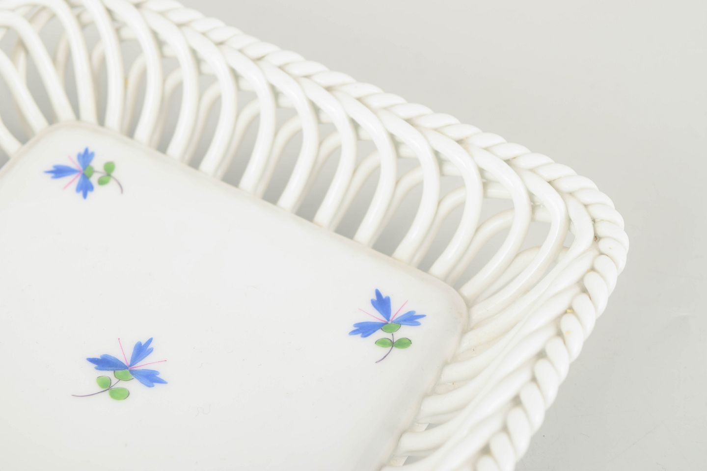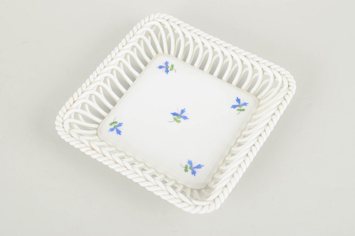 Fint og dekorativt porcelænsfad fra Herend med gennembrudt flettet rand og håndmalet blå blomstermotiv i spejlet. Den åbne kurverand giver fadet et let og elegant udtryk, typisk for fabrikkens klassiske produktion i mellemkrigstiden. Et charmerende mindre serveringsfad med raffineret detaljering.