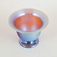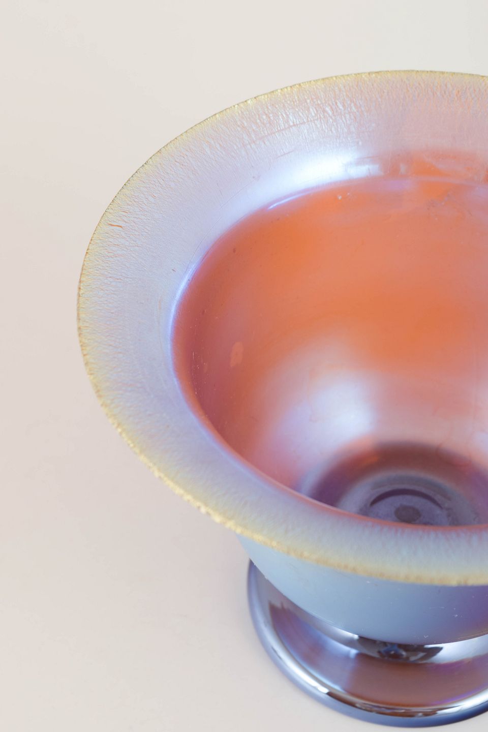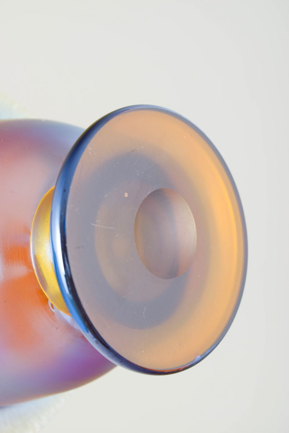 Skålformet vase i mundblæst glas med bred, let udadbøjet rand og kort standfod. Overfladen har en silkemat iriserende finish i blå og violette nuancer med varmt kobberfarvet skær indvendigt. Den enkle, klassiske form kombineret med det levende farvespil er karakteristisk for Loetz’ produktion i 1920’erne, hvor harmoniske proportioner og metallisk glans var centrale æstetiske virkemidler.