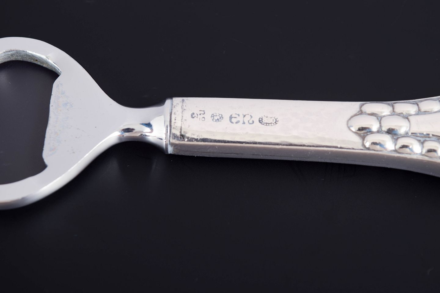 Art deco flaskeåbner i tretårnet sølv og rustfrit stål. Model nummer 3 med enkel, geometrisk skaftform typisk for perioden. Fremstillet hos Evald Nielsen.