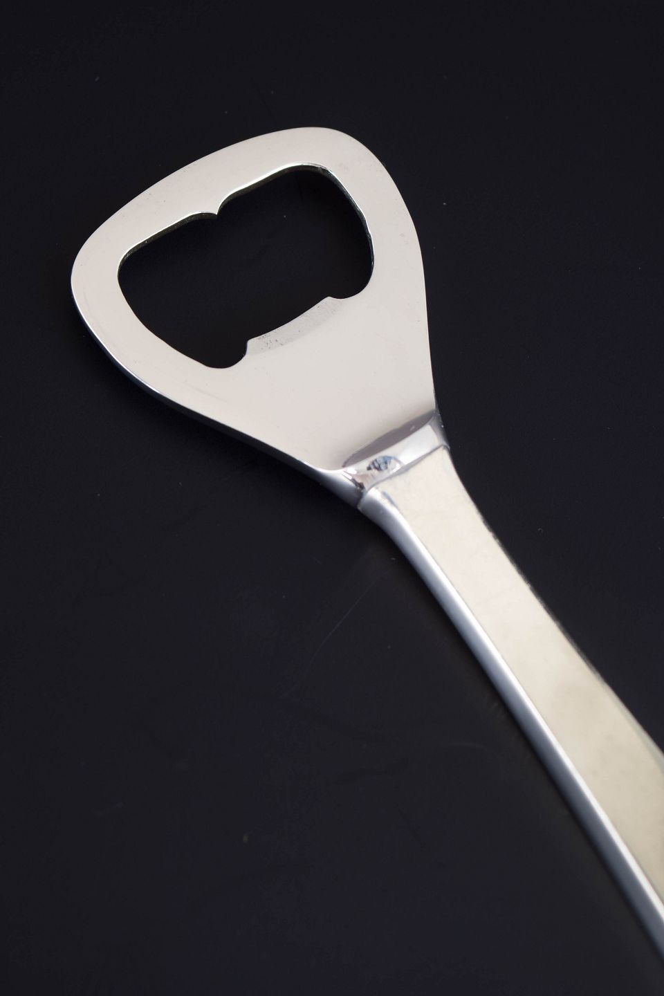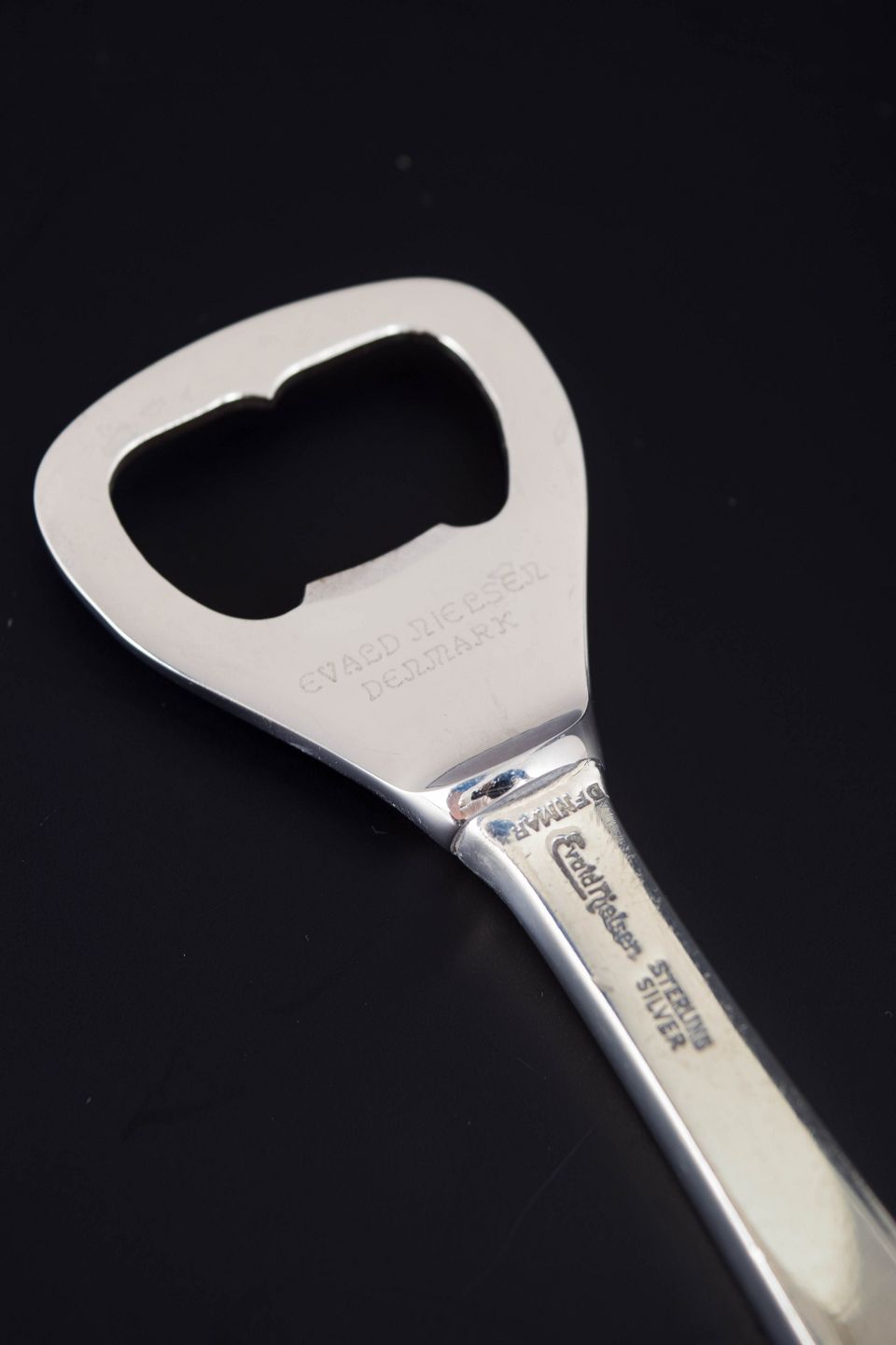 Elegant flaskeåbner i sterlingsølv og rustfrit stål med enkel, stram formgivning præget af art deco-periodens geometriske linjer. Fremstillet hos Evald Nielsen.