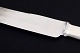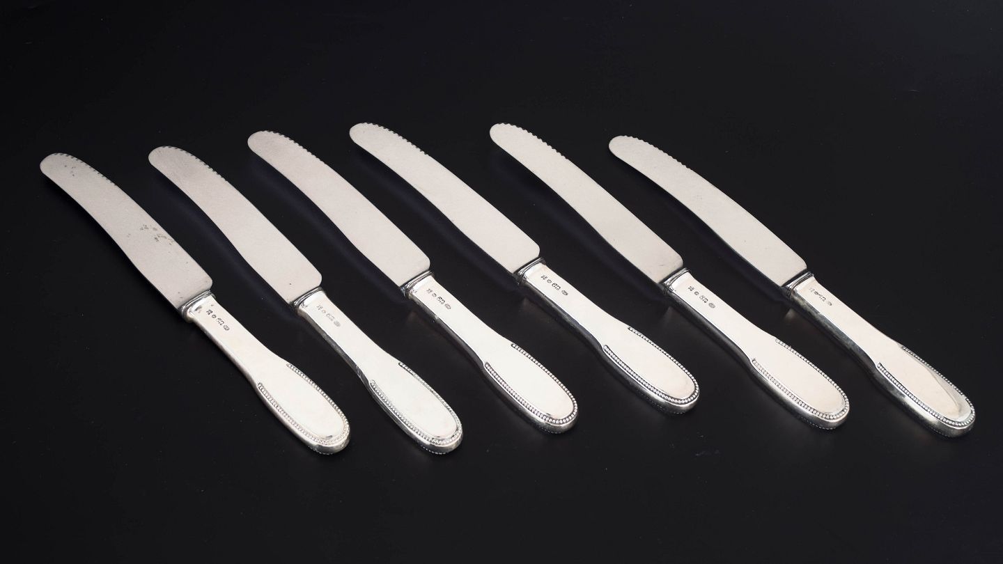 Elegante middagsknive i tretårnet sølv og rustfrit stål. Model nummer 14 med klassisk, let afrundet skaftform med diskret perlekant og glat klinge med skær. Fremstillet hos Evald Nielsen.