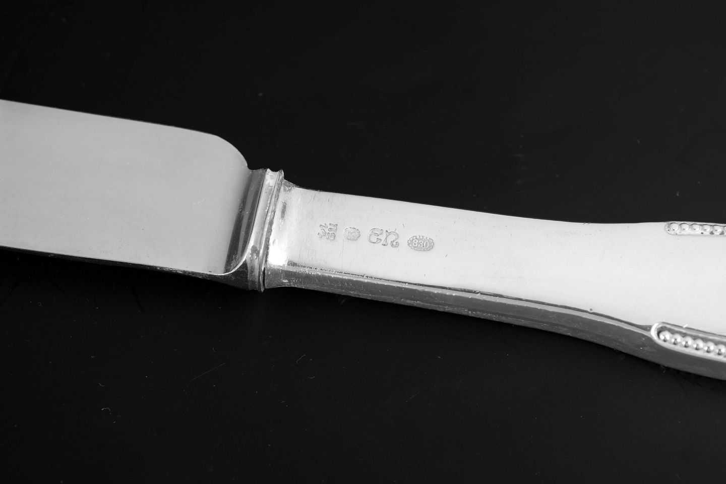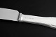 Elegante middagsknive i sølv 830 og rustfrit stål. Model nummer 14 med klassisk, let afrundet skaftform med diskret perlekant og glat klinge med skær. Fremstillet hos Evald Nielsen.