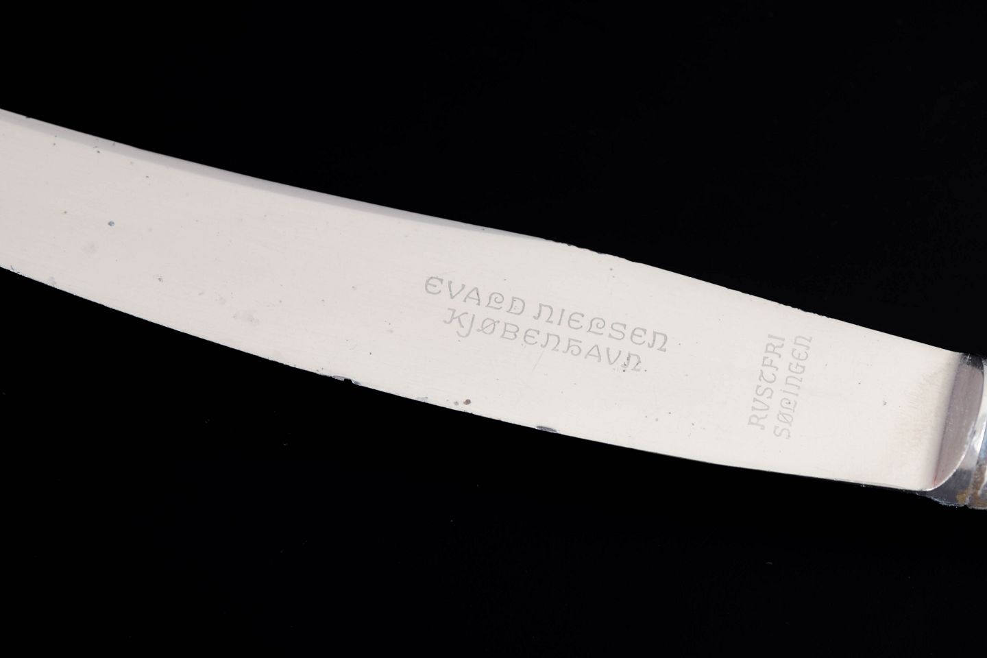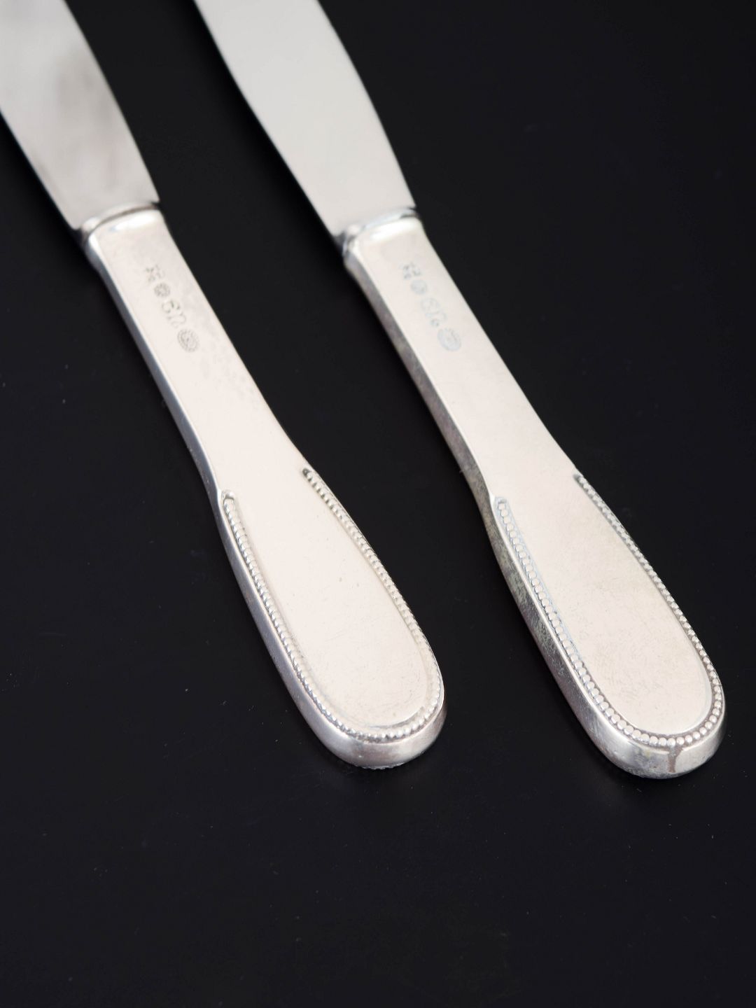 Elegante frokostknive i sølv 830 og rustfrit stål. Model nummer 14 med klassisk, let afrundet skaftform og glat klinge. Fremstillet hos Evald Nielsen.