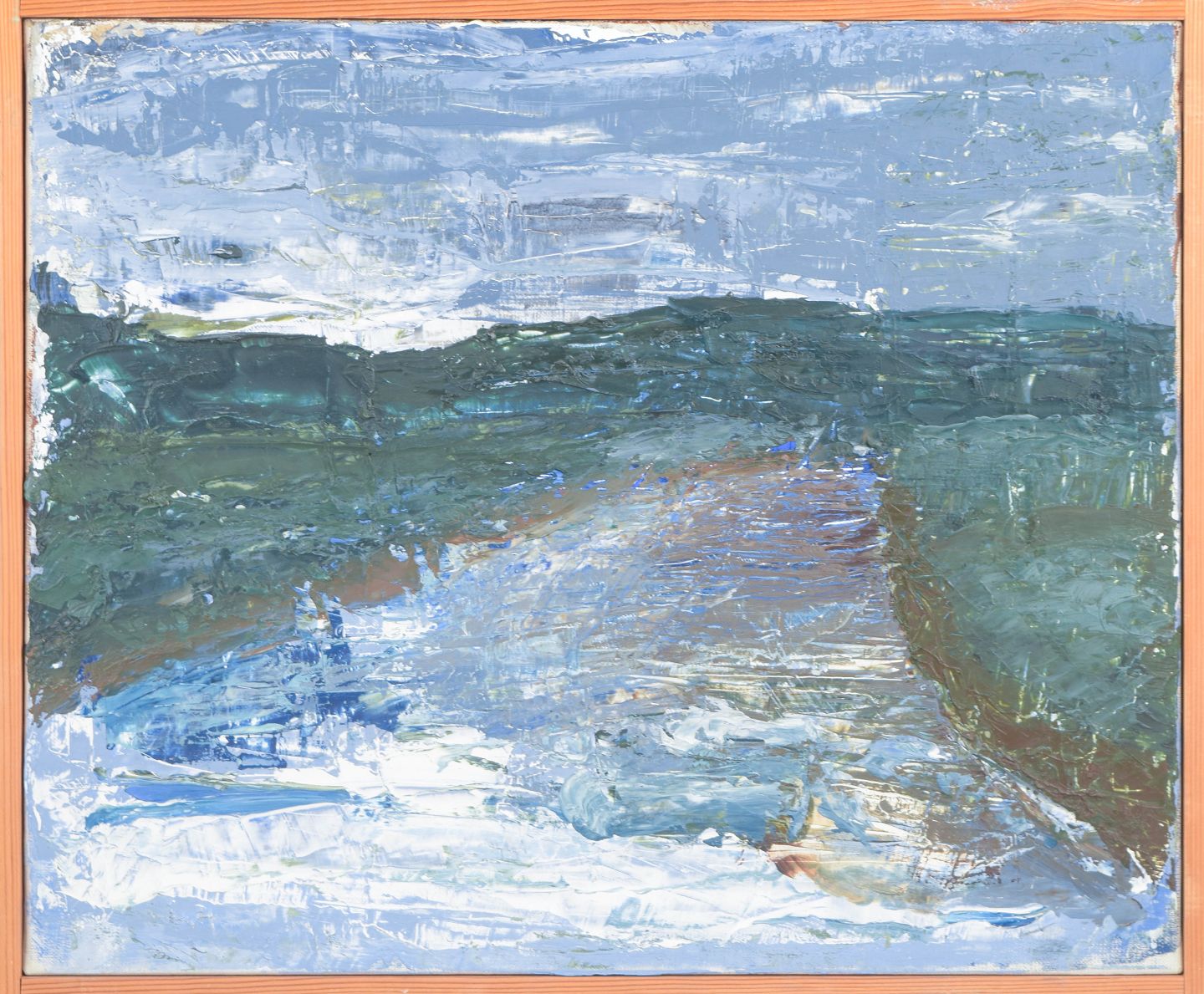 Expressive landscape composition executed with thick impasto brushstrokes and broad colour areas in blue, green and earthy tones. The composition suggests an open landscape with a stream or path, rendered in a free painterly manner typical of Scandinavian modernism of the 1970s. Unsigned.