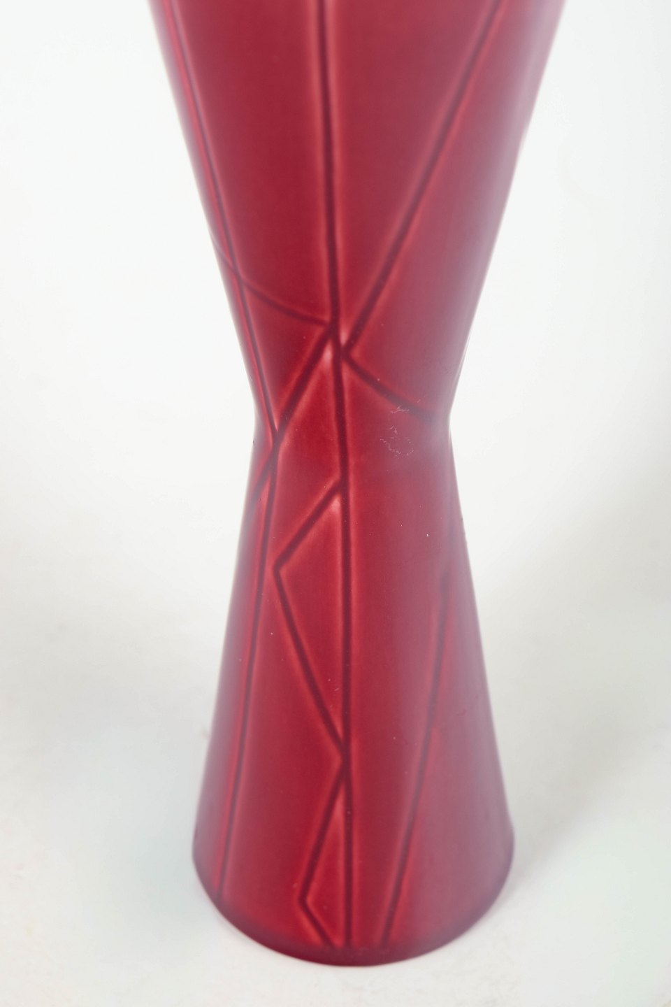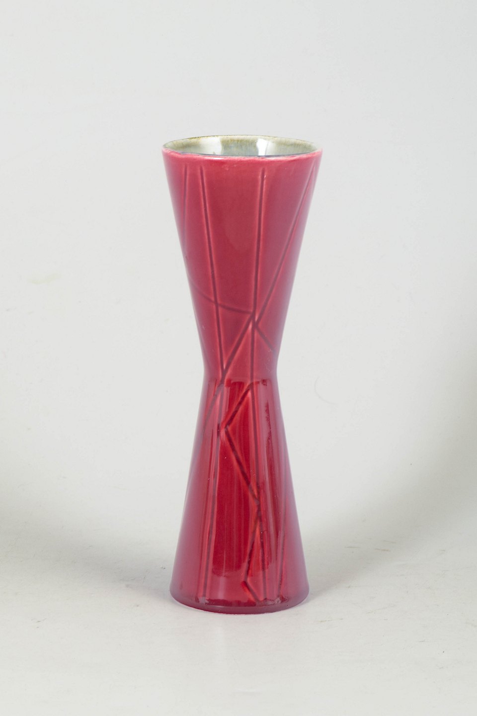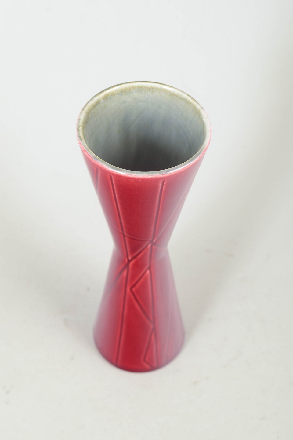Slank timeglasformet vase i glaseret stentøj med dyb rød glasur og indridset dekor. Modellen "California" er et karakteristisk eksempel på Stålhane’s elegante og stramt formgivne keramik fra perioden.