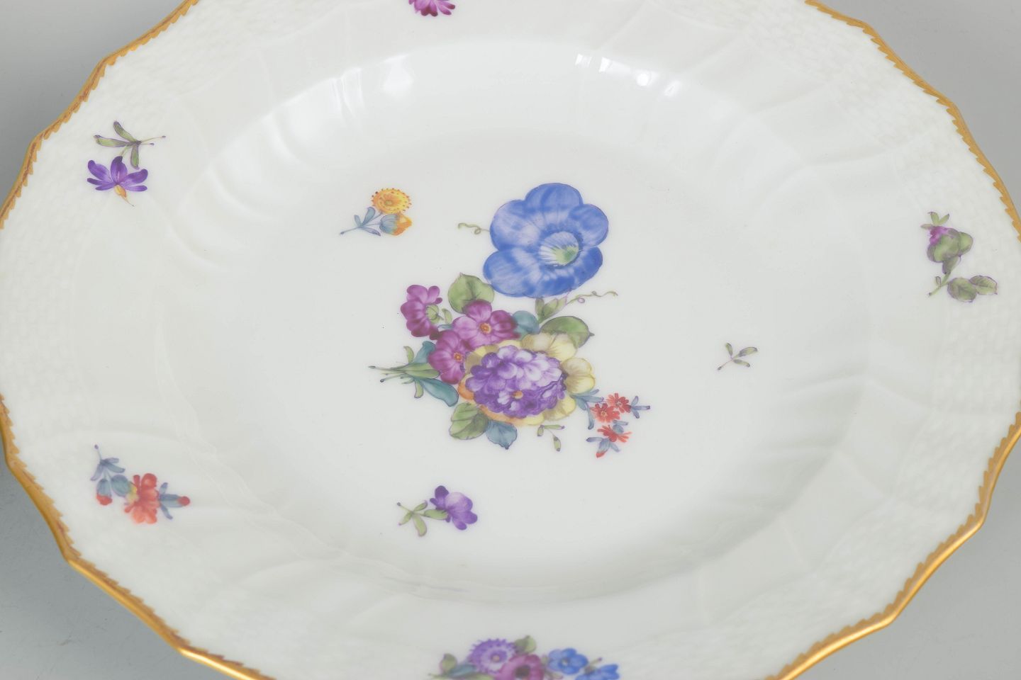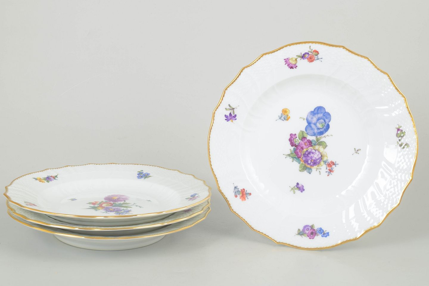 Elegant set of four porcelain dinner plates decorated with hand-painted floral motifs in the Saxon flower pattern and finished with a gilded rim. Model 4/1621. First factory quality.