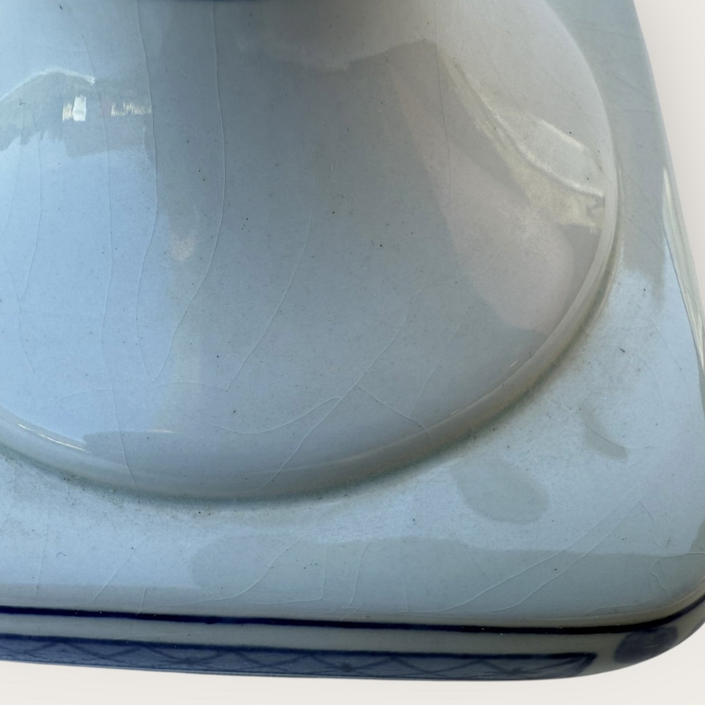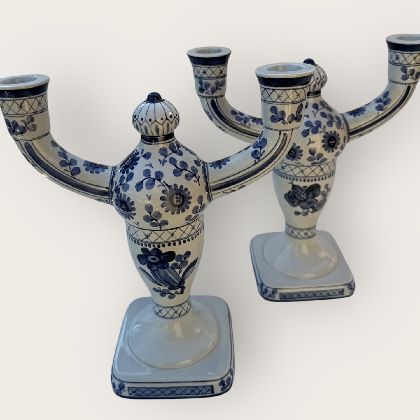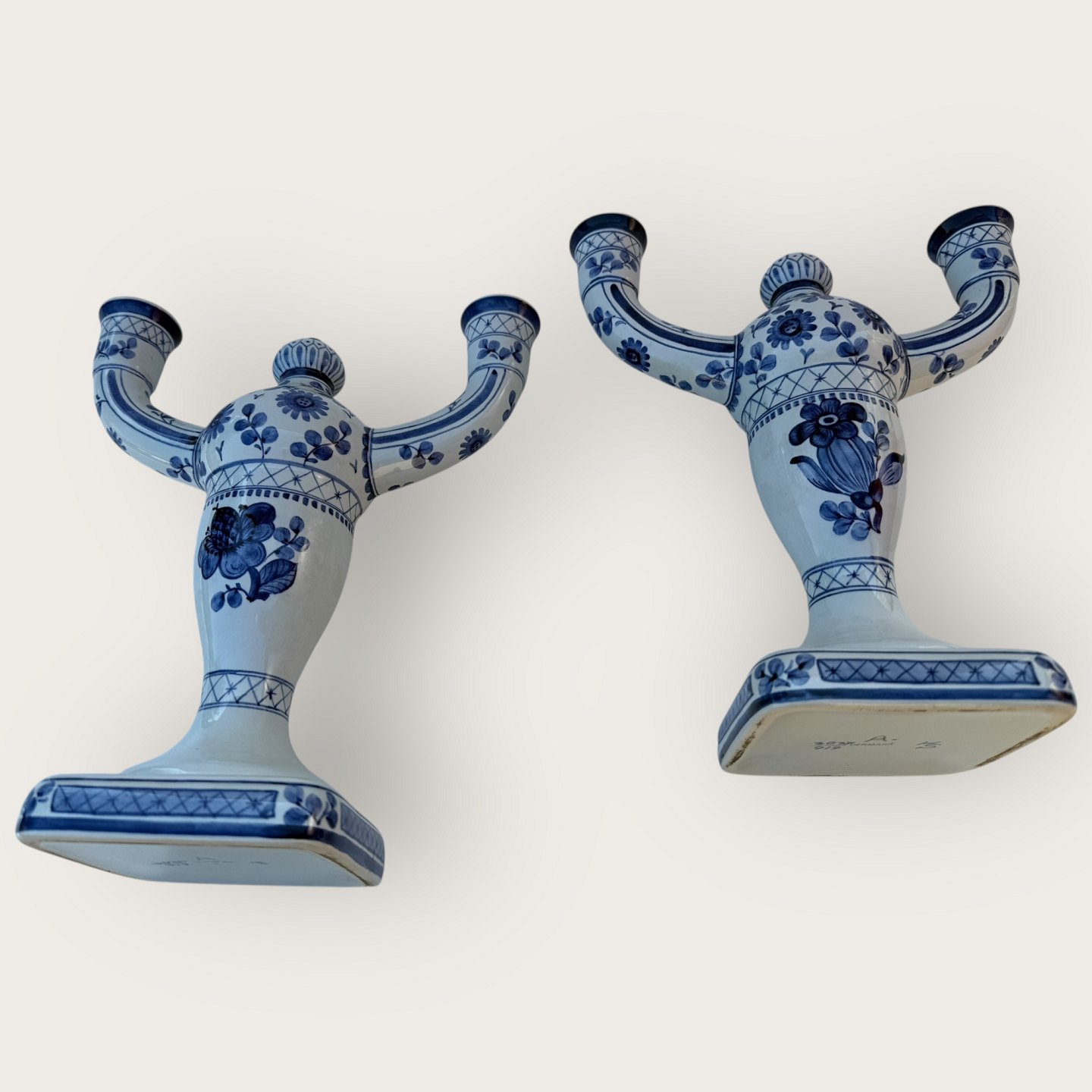 Royal Copenhagen, Aluminia, Tranquebar A set of 2-armed candlesticks, #3037/919, a few small cracks under the glaze, otherwise very good condition, 1st grade, design Christian Joachim, Dimensions for one candlestick: Height 25.5cm, width 22cm, sold together.