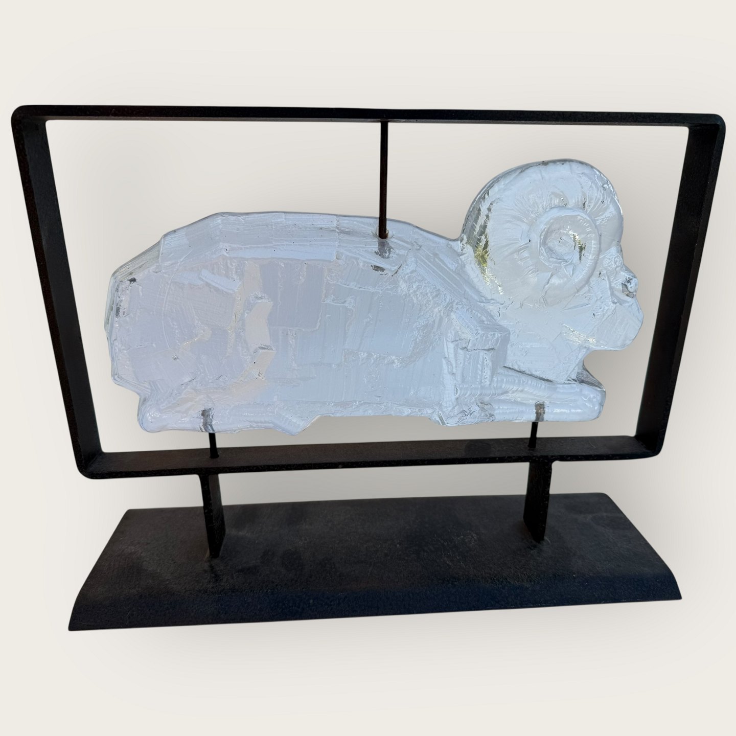 Kosta Boda, Erik Höglund, glass figure of a ram mounted in a metal frame; Dimensions: 25x33x11cm, * Slight marks in the glass around the metal mounting (see photo) otherwise very good condition*