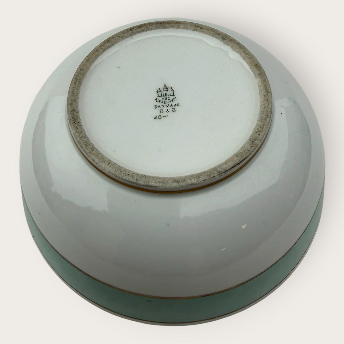 Bing & Grøndahl, Form 643 med bred turkis dekoration og guldkant, Serveringsskål, #43, 8cm høj, bredde 21cm, 2. sortering, *Pæn stand*