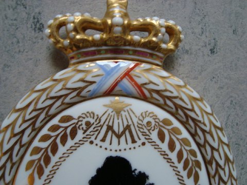 Oval plakette med gennembrudt forgyldt krone. Fane med forgyldt laurbærkrans mm samt de danske og franske farver og årstallene 1865-1909 med dannebrog på begge sider. Center med den sorte silhuet af prinsessen og Monogram M samt HKH's "Varemærke" Ankeret (Sømandsprinsessen).