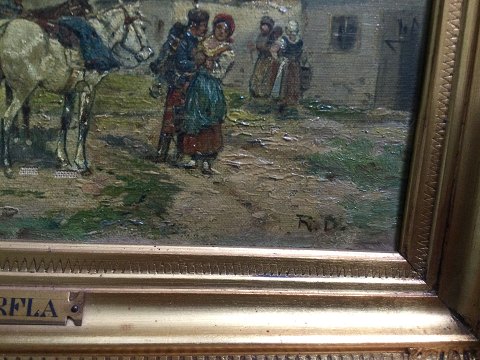 Anton Rudolf Derfla (født 1849): 2 malerier med Bosniske Husarer på stop ved huse på vejen. Olie på plader Det ene sign.: R.D. - det andet sign.: R. Derfla Messingskilte - R: DERFLA 17x31 (28x42)