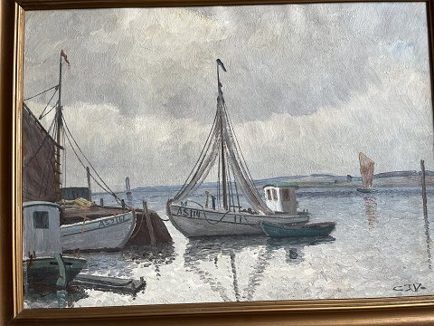 Chr. Jensen Virklund (født 1896): Havneparti, Silkeborg. Olie på lærred. Sign.: CJV 32x44 (39x50)