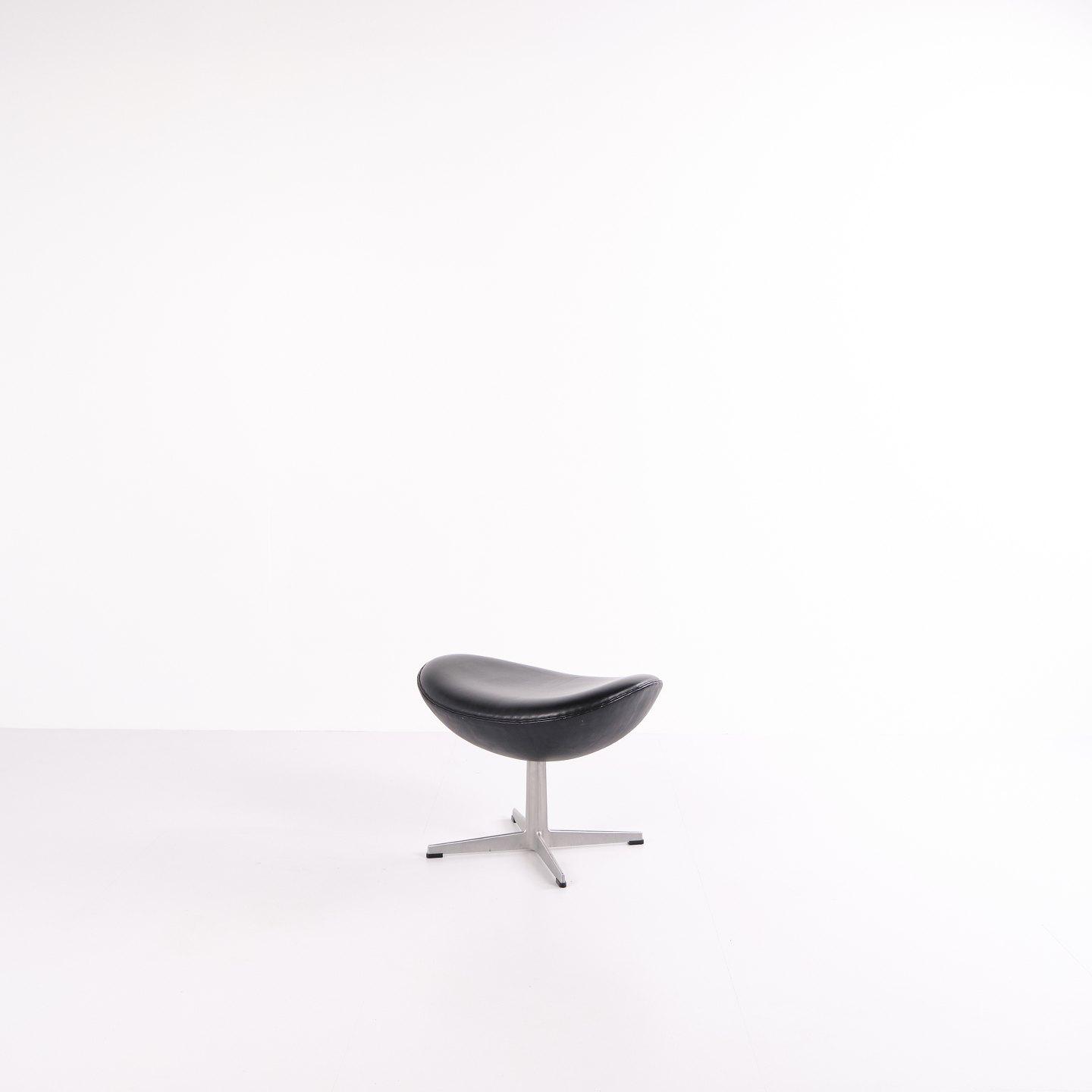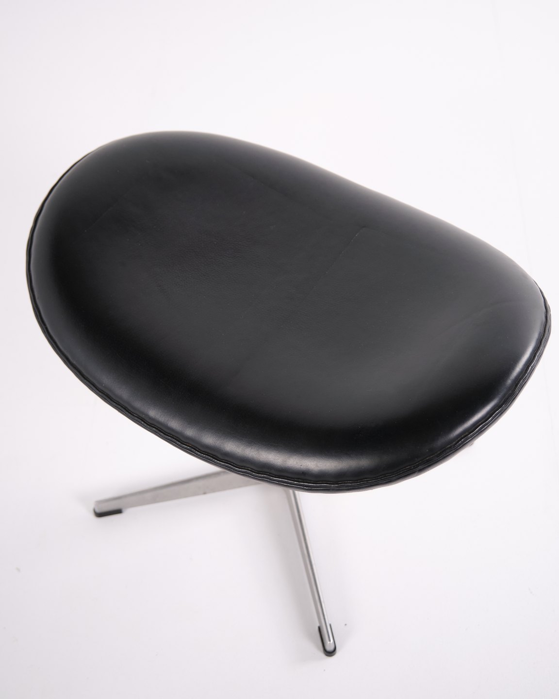 Stool for the Egg Chair, designed by Arne Jacobsen and produced by Fritz Hansen in 2006. Upholstered in black Elegance leather and fitted with an aluminium star base. High-quality materials and craftsmanship consistent with Fritz Hansen’s production standards.