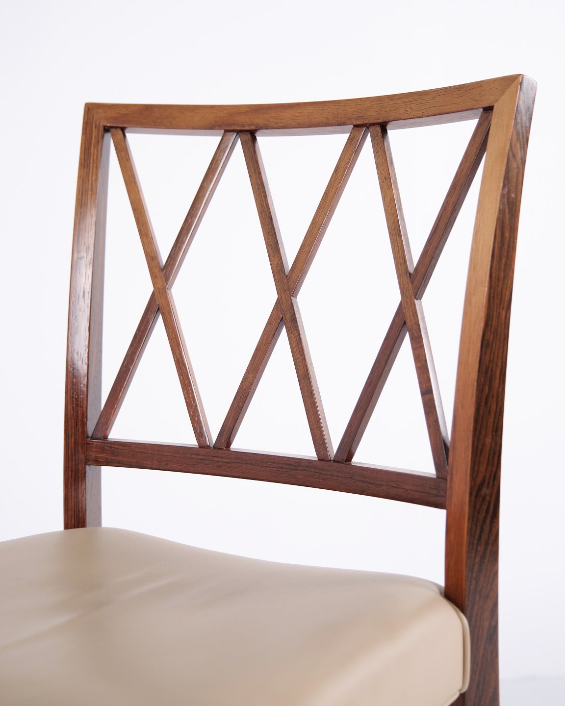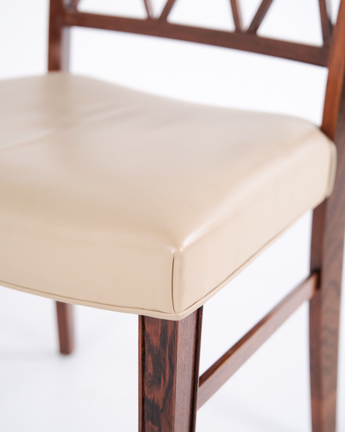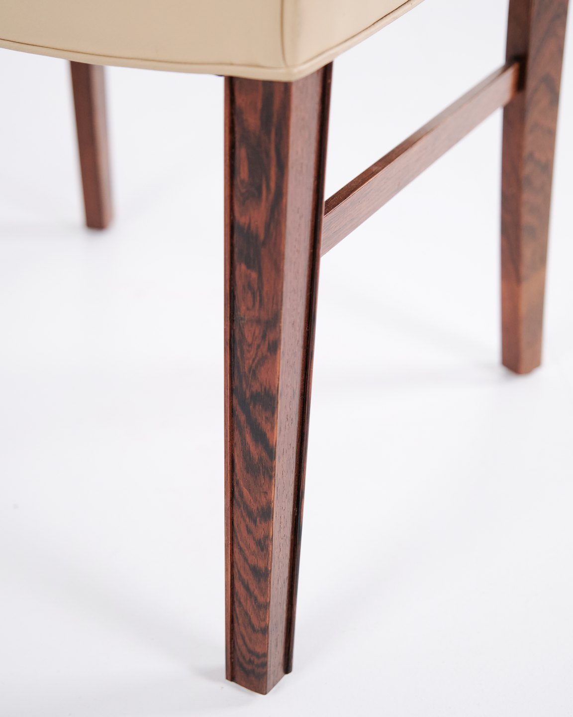 Sæt af fire spisebordsstole af Ole Wanscher for A.J. Iversen. Palisander og cremefarvet læder. Dansk design fra 1960’erne.