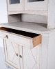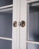 Skabet står på elegante, tilspidsede ben og har en overdel med glaslåger, der giver et let og klassisk udtryk. Indvendigt findes fire hylder i vitrinedelen, mens nederdelen rummer både en praktisk skuffe og opbevaringsplads.