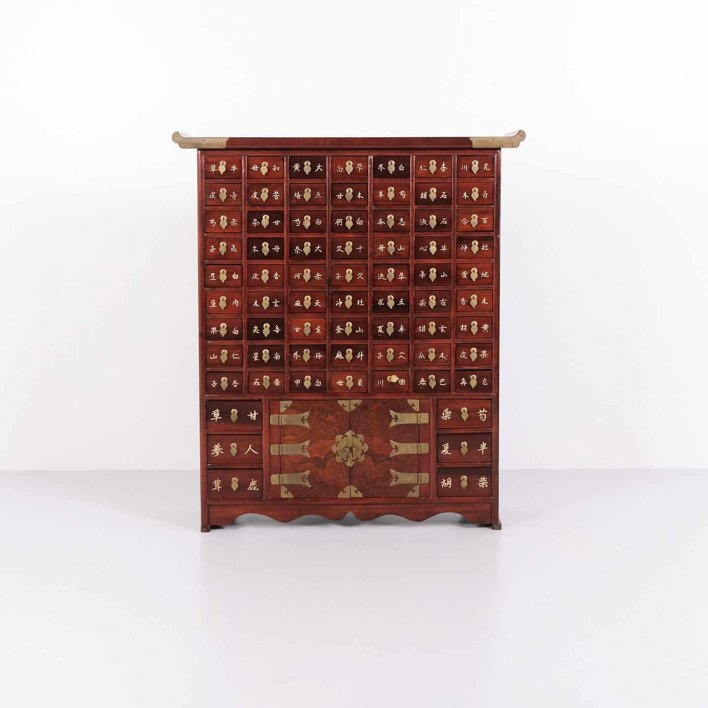 Antikt Apoteksskab med 69 Skuffer i Mørkt Træ og Messingbeslag, Koreansk Stil år 1910