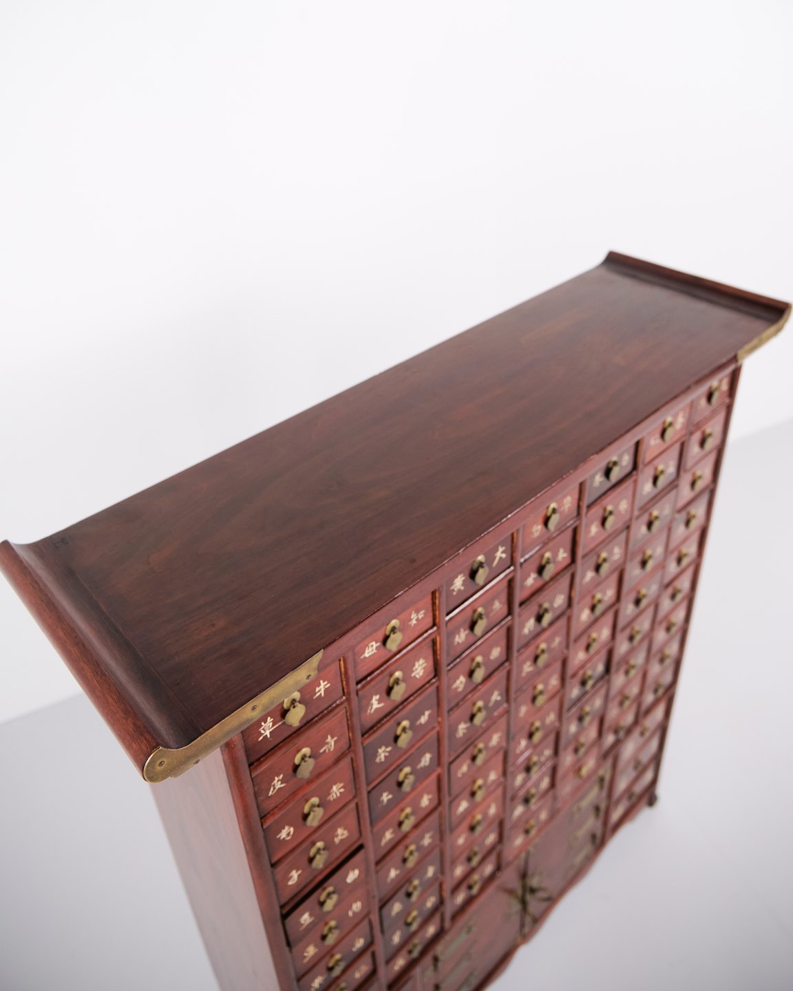 Antikt apoteksskab i mørkt træ med 69 skuffer og messingbeslag. Koreansk stil fra ca. 1910. Dekorativt og karakterfuldt opbevaringsmøbel.
