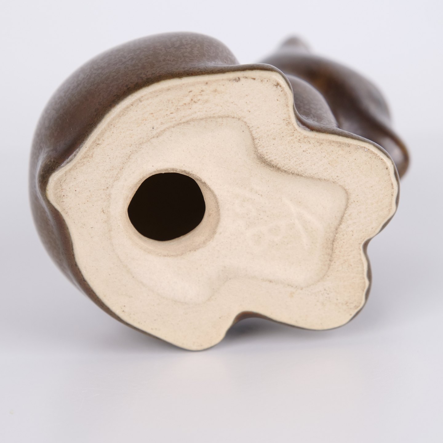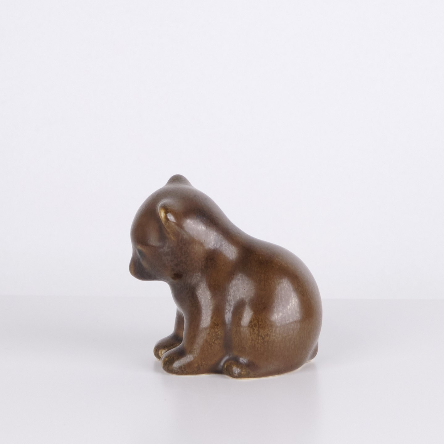 Bjørnefigur af Knud Basse udført i brun glaseret keramik. Figuren er modelleret i siddende form med let bøjet hoved og afrundede linjer, som giver et roligt og karakterfuldt udtryk. Et fint eksempel på Knud Basses populære dyrefigurer og dansk kunstkeramik fra midcentury perioden.