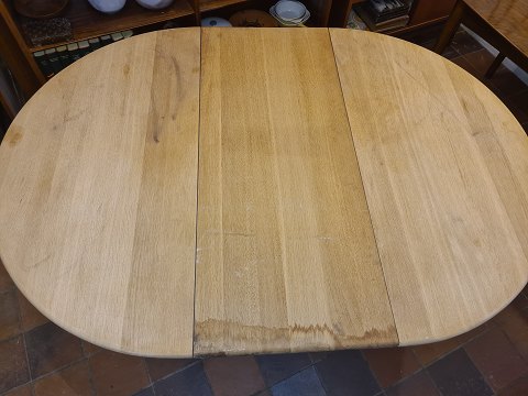 Kurt Østervig rundt spisebord udført i massiv eg samt 1 stk. tillægsplade også massiv eg. Fremstillet hos KP Møbler ca. 1980'erne. Mærket herfra.