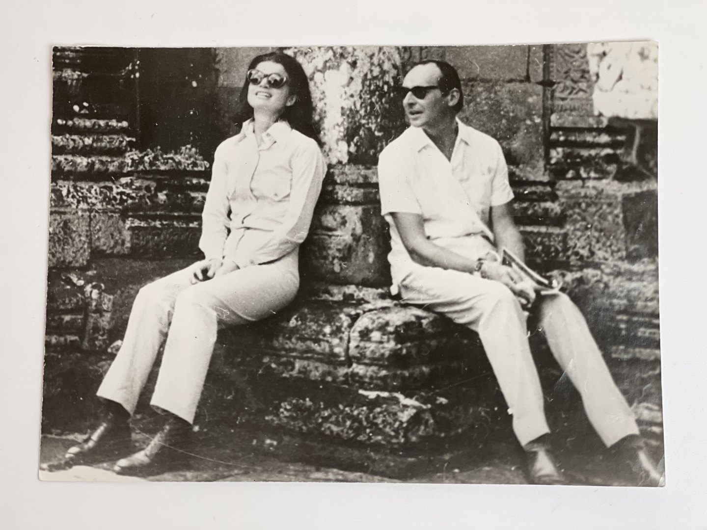 The photo shows Jackie Kennedy and the British Lord Harlech sitting together in front of a temple in Cambodia.