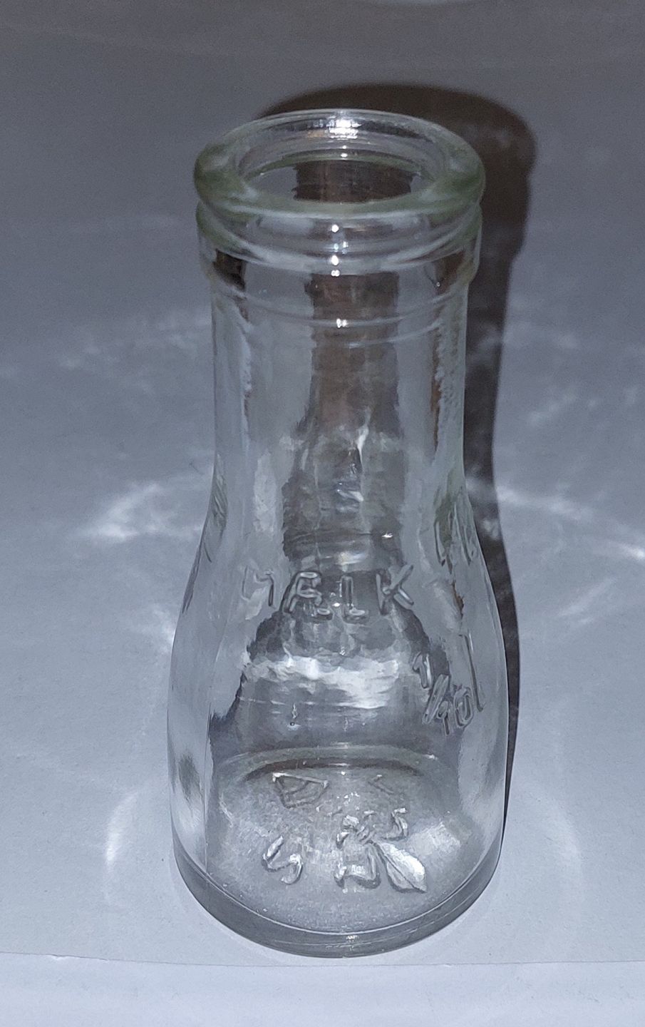 Danish glass bottle: Small bottle for cream. Made in Denmark. In good condition. H. 12 cm (4.72 inches). Text on one side in danish in relief (MÆLK - FLØDE): MILK - CREAM 1 / 10L.