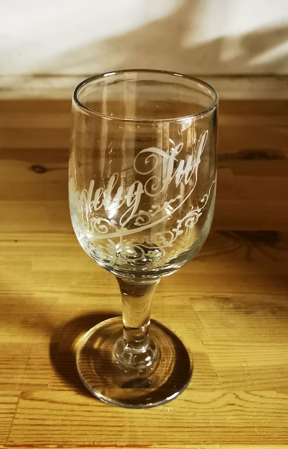 Don Carlos vinglas fra Aalborg Glasværk fra omkring 1900. Dekoreret med "Glædelig Jul". Fremstår i god stand uden skader eller reparationer. H. 18 cm