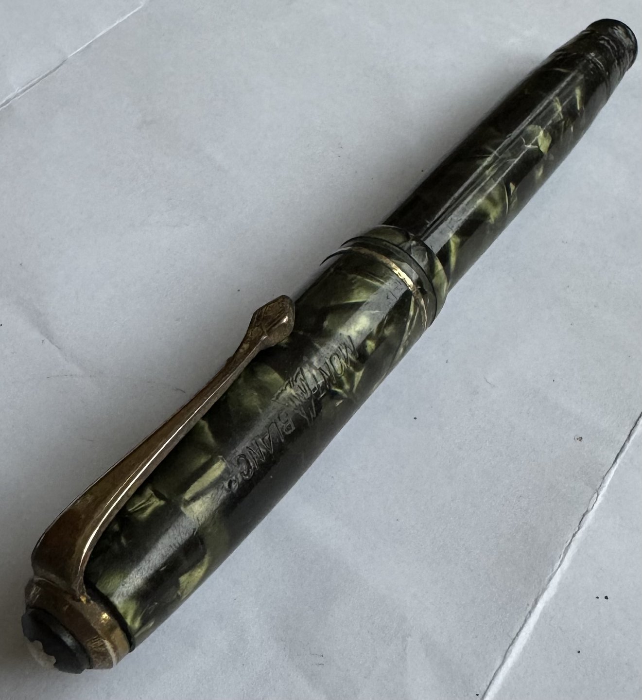 Green marbled Montblanc no. 244 fountain pen. Made around 1950. All parts original Montblanc parts. The little cap on the bottom of the fountain pen is completely bitten out of shape. In addition, a metal cap belt is missing On the cap. Otherwise no defects or missing parts. A new rubber sack must be inserted before it will work again. This can be added with a supplement of DKK. 225.- Dimensions: L. 13 cm.