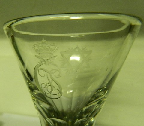 Timeglasformet frimurerglas med facetslibninger. Kugleslebet på bunden. Slebet monogram FSC under krone - samt Davidsstjerne på bagsiden. Fremstillet omkring 1910. I perfekt stand. 12½ cm høj.