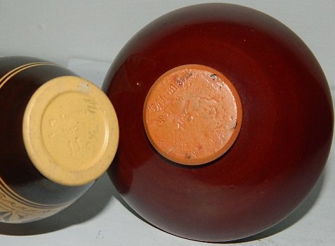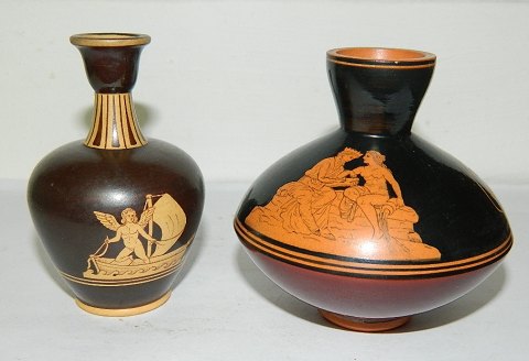 To mindre vaser i bemalet terracotta fra P. Ipsen, København. Fremstillet ca. 1880-1900. Bemalet med figurgrupper i græsk stil. Den buttede har et "nåle-stiks" skår der ses i form af en lys plet. Ellers fremstår begge i faktastisk stand. Fabriksmærkede på bunden med navn samt modelnummer. Hhv. 8½ cm og 9 cm høje.