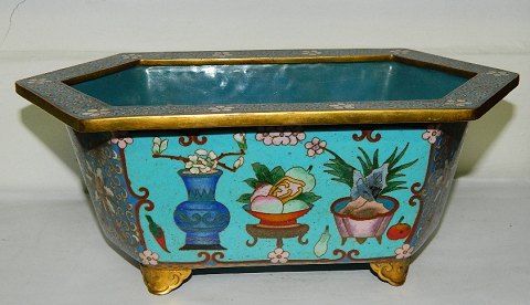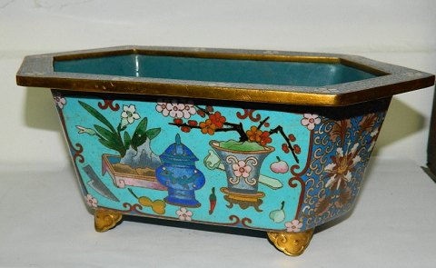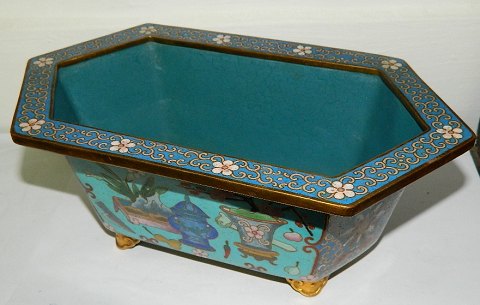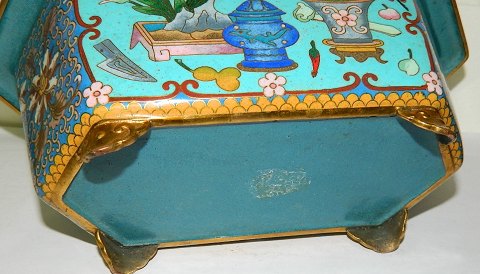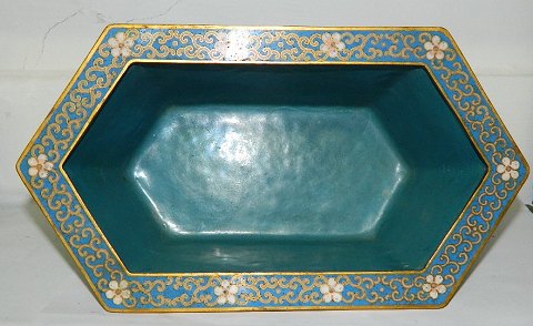 Cloisonné skål i bronce med emalje dekoration. I perfekt stand. Fremstillet i første halvdel af det 20. århundrede. 10½ cm høj - 26 cm lang og 14½ cm dyb.
