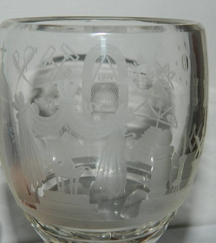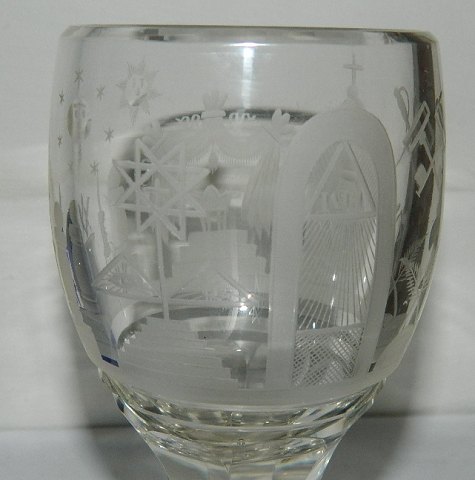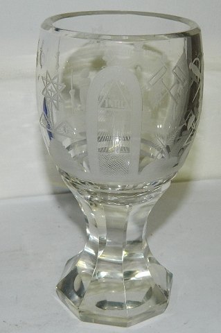 Tungt frimurerglas med mange slebne symboler. Facetslebet stilk og fod. I perfekt stand. 15 cm høj.