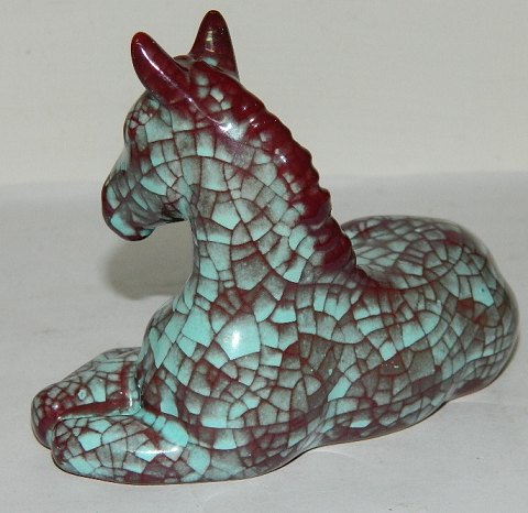 Figur i keramik af liggende hest fra MA&S, Bornholm. Dækket i persian glasur. Fabriksmærket samt fabrikslabel på undersiden. 8 cm høj og 12 cm lang