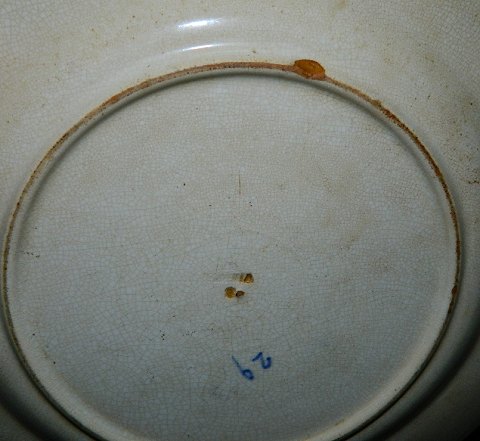Aluminia tallerken i fajance fra Aluminia. Dekoreret i noget der ligner musselmaling på porcelæn. Krakkeleret under overfladen. Lille skår på bagsiden. Indstemplet ALUMINIA samt model nr. 29. 25 cm i diameter.