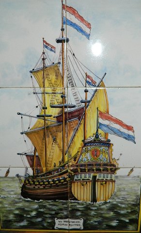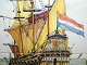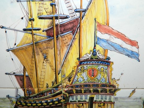 Bemalede kakler med motiv af hollandsk sejlskib fra 1700-tallet. I god stand. Formoder dette skibsbilled er malet omkring 1940.