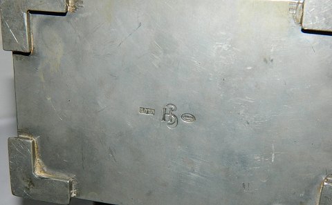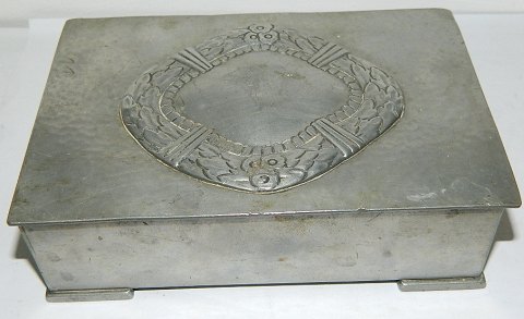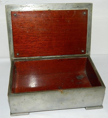 Cigar skrin i tin. Dekoration på låget med blomsterkrands. Stemplet HPH - Hertz/Ballin. Til at begynde med fremstillet på Mogens Ballin´s værksted. Efterfølgende fortsatte produktionen hos Peter Hertz. Skrinet er indenvendigt beklædt med træ. Fabriksstemplet på bunden. Mål: 5 cm høj - låget måler 15½ cm x 10½ cm.