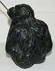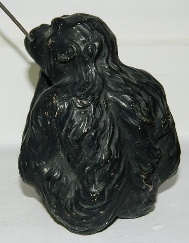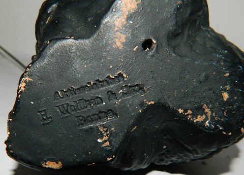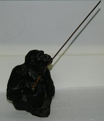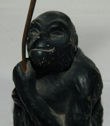 Sjælden figur i keramik af chimpanse med stang i metal. Produceret hos Aktieselskabet H. Wolffsen & Søn i Rønne på Bornholm. Modelleret af Hans Ancher Wolffsen (1870-1924). I perfekt stand. 13 cm høj - 23 cm høj incl. metalstang.