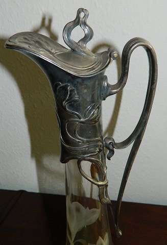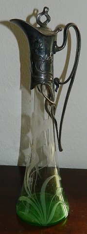 Tysk WMF (Württembergische Metallwarenfabrik AG) kande i glas med metalmontering i jugend-stil. Kanden overvejende grøn i bunden. Blomsterslibning rundt om kanden. Både glas kanden og metalarbejde i god stand. Produktionsår stemplet indenvendigt i låget "1903". Hanken fabriksstemplet. 41½ høj LIGNENDE KØBES