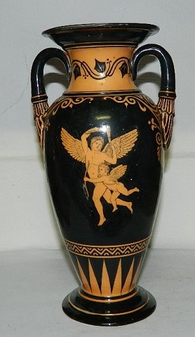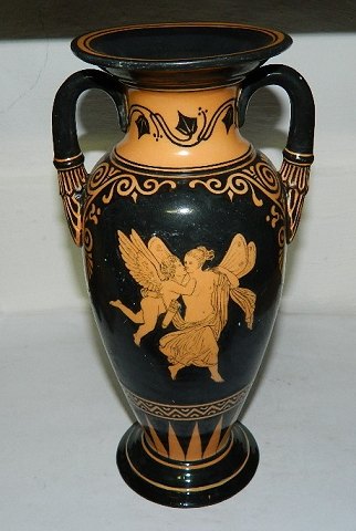 Vase i porcelæn fra Royal Copenhagen med bemalede motiver af Bertel Thorvaldsen: På den ene side "Amor og Hymen" på den anden side "Amor og Psyke". Fremstillet omkring 1860-80. Fremstår i perfekt stand. 20½ cm høj.