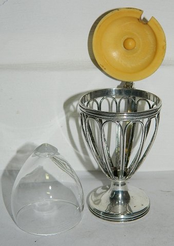 WMF sennepskrukke i sølvplet med glasindsats. Fremstillet ca. 1920. Alle dele i god stand. Fabriksmærket på hanken. 11½ cm høj.