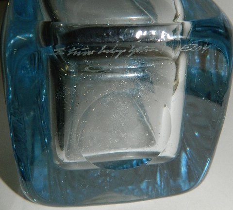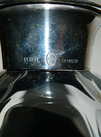 Moderne glaskaraffel fra Strømbergshyttan. Fremstillet ca. 1955. Monteret med sølvkrave. Stemplet HRH 830S DENMARK. Karaflen indridset på bunden. I perfekt stand. Ingen skader eller reparationer. 28½ cm høj incl. prop.