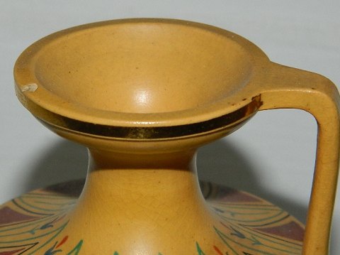 Vase i terracotta fra Peter Ipsen, Kjøbenhavn. Dekoreret med ægyptiske motiver og dekorationer. Fremstillet omkring 1880. Har et lille skår kantens overflade. Fabriksstemplet på bunden. 14½ cm høj LIGNENDE KØBES