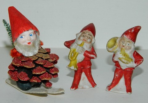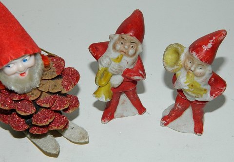 Par nisser i porcelæn fra omkring 1900. Spillende på blæseinstrumenter. Nissen på trompet med skade på trompet samt venstre fod. 5½ cm høj. Begge nisser koster d.kr. 250,00. Koglenissen koster d.kr. 75,00.