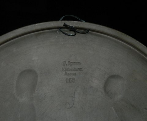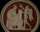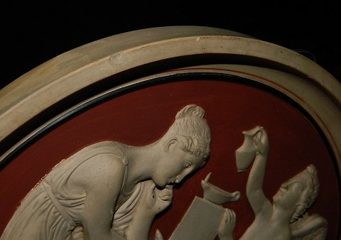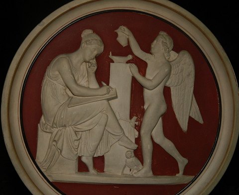 Relief i teracotta med bemalet baggrund. Bertel Thorvaldsen motiv fra begyndelsen af 19. århundrede. Platten, der er fremstillet hos Peter Ipsen, København, fremstår i god stand. Har dog et par små skår. Fabriksmærket på bagsiden. 24½ cm i diameter.