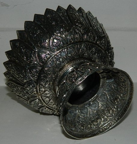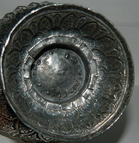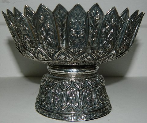 Skål i sølv på fod. Fremstillet i Persien i 19. århundrede. Fremstår i perfekt stand. Hverkan sølvstemplet eller fabriksmærket. Metallet er dog tested, hvorfor der medfølger garanti for at metallet er sølv. Ca. 110 gram. Ingen skader eller reparationer. 10½ cm høj. Åbningsdiameter 14½ cm. Bundens diameter er 8½ cm.