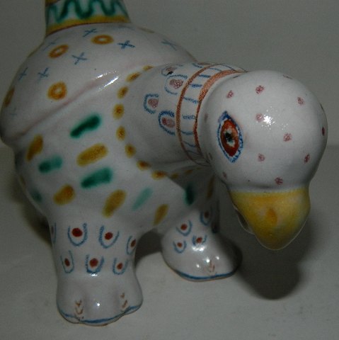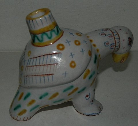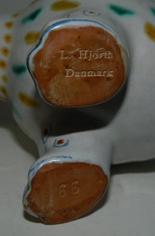 Fabeldyr fra keramikfabrikken Lauritz Hjorth, Rønne, Bornholm. Formodentlig fremstillet som blækhus. Tilskrives skulptøren Gertrud Kudielka. Fabriksmærket på bunden sammen med modelnummer 99. I god stand uden skader eller reparationer. 10 cm høj og 13 cm lang.